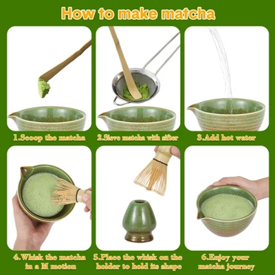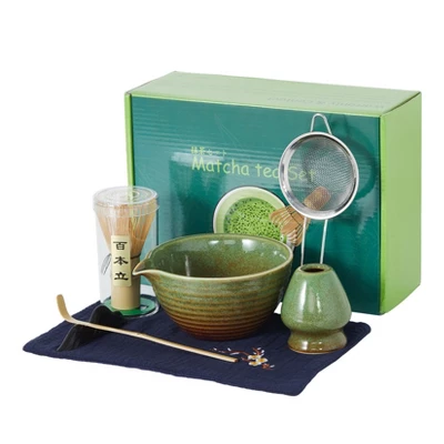 7 Pcs Matcha Whisk Set with Ceramic Bowl & Holder, Bamboo Whisk, Scoop & Rest, Stainless Steel Sifter, Tea Towel – Transmutation GreenAbout this itemComplete Matcha Kit: Includes 7 essentials—ceramic matcha bowl, whisk holder, bamboo whisk, bamboo scoop, scoop rest, stainless steel sifter, and tea towel—for an authentic tea-making experience.Premium Materials: Made with food-grade ceramic, natural bamboo, and stainless steel for safety, durability, and elegance. Ceramic surfaces resist stains and are easy to clean.Elegant Design: Features a unique transmutation green glaze on the bowl and whisk holder, blending traditional Japanese aesthetics with modern style.Practical & Functional: Falcon beak spout ensures smooth, drip-free pouring, while the handcrafted bamboo whisk creates creamy, frothy matcha for perfect texture and taste.Gift-Ready: Beautifully packaged, this matcha set makes a thoughtful gift for birthdays, holidays, or tea lovers at any stage—from beginners to experts.