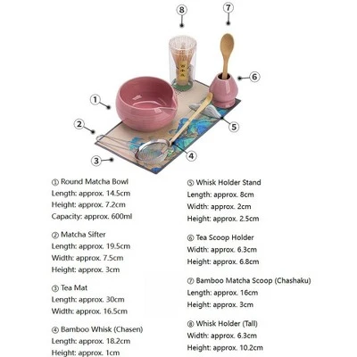 SpecificationColor: PinkMaterial: Ceramic + Bamboo + Stainless SteelProduct Dimensions: 10.55 x 7.6 x 3.1 inchesItem Weight: 1.65 lbsPackage List1x Round Matcha Bowl1x Bamboo Whisk (Chasen)1x Bamboo Matcha Scoop (Chashaku)1x Whisk Holder Stand1x Tall Whisk Holder1x Stainless Steel Sifter1x Tea Cloth1x Tea Spoon & Scoop Holder