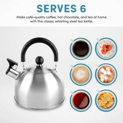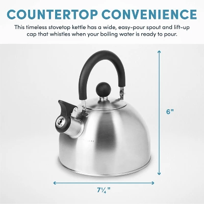 This attractive Aroma 1.5qt stove top kettle adds a timeless style to your kitchen. The stay cool handle will protect your hand from the heat and the handle folds down for easy storage in tight spaces. The brushed stainless steel finish and class shape make this the perfect addition to your kitchen.