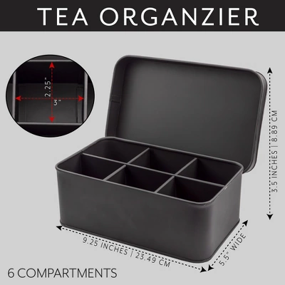 Tidy up your tea bags with our lovely 6-section tea bag tin. In an elegant reproduction enamelware design with top label “tea bags” our tea storage chest is perfect for your everyday cup of tea or serving tea at your next tea party. With six compartments, you can easily organize up to 6 flavors of your favorite teas. Good quality tea deserves a pretty tea tin. This tea box is charming to keep on your counter or sideboard or shelf for convenient access.