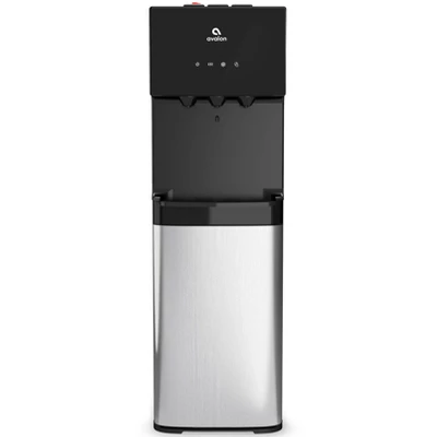 The Avalon 3 Temperature Bottom Loading Water Cooler with Child Safety Lock is made with an innovative stainless steel body. It offers a choice of 3 water temperatures. The easy-to-use push button spouts make it so much more convenient to use. Simply press the temperature button of choice and allow the water to flow from the given spout. The machines highly efficient compressor makes the cold water crisp and ice cold at approximately 47° F without the need of adding ice cubes to your drink. The hot faucet is hot enough to cook one’s tea or coffee or any other steaming hot beverage at approximately 185° F. Due to the extremely hot water, we’ve added a child safety lock on the hot water faucet. We have incorporated a nightlight that can be switched on from the back of the unit. This will make filling up your cup at night so much more simple and easy. The dispensing area is 12x3x10 inches with 9 inches of space below the spouts. This will accommodate most large cups or bottles. There is a removable drip tray at the bottom of the dispensing area to catch any drips or spills. This water cooler is bottom loading with a cabinet to hold 3 or 5 gallon bottles. The water is pumped from the bottle through the machine. There is also an empty-bottle indicator that will light up when the bottle needs to be replaced. The water cooler is UL listed and complies with all standards of Energy Star. The unit dimensions are 41x12x13 inches.