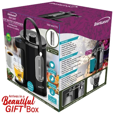 Use the powerful Brentwood® 1,100-Watt 3-L Digital Glass Instant Hot Water Dispenser with Tea Infuser to prepare your favorite hot drinks. Enjoy any variety of tea, hot chocolate, coffee, a squeeze of lemon, and more with a single touch. Instantly dispense 5 oz. or 10 oz. of continuous hot water. Adjust the temperature between 104°F and 212°F. The large 3-L tank holds 16 servings. The tank lifts off the base using its large handle for easy filling and cleaning. Always know how much water is in the tank with the window and water level indicators. The hot water dispenser accommodates mugs up to 7-in. tall. The unit is entirely BPA-free and FDA approved._