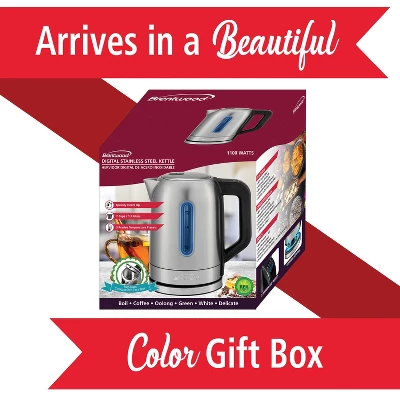 Quickly heat water for tea, coffee, and food with the powerful Brentwood 1,500-Watt 1.79-Qt. Cordless Digital Stainless Steel Kettle. It features 5 precise temperature presets, a stainless steel body and lid, and concealed heating element. The plastic water level window itself is rimmed in gorgeous blue LEDs that light up while the water is boiling. You’ll also enjoy easy, cordless serving thanks to its 360° swivel base. The kettle is entirely BPA-free with auto shutoff, boil dry, and overheat protection for added safety.