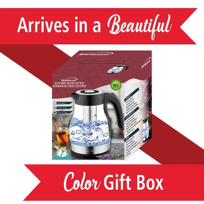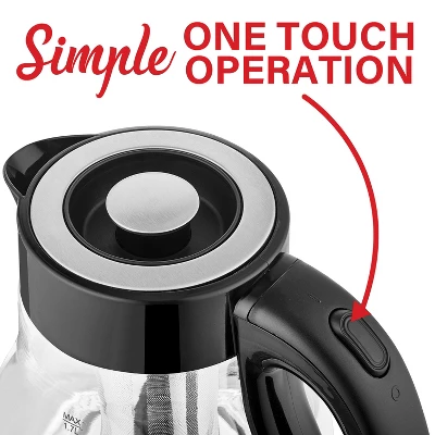 Boil water in minutes with the powerful Brentwood Black 1,100-Watt 1.79-Qt. Cordless Glass Electric Kettle with Tea Infuser. The kettle lifts off the 360° swivel base for easy filling and pouring. It has a full glass kettle, concealed heating element, and is BPA-free. Auto shutoff, boil dry, and overheat protection are included for added safety. The unit also automatically shuts off once water reaches a boil.