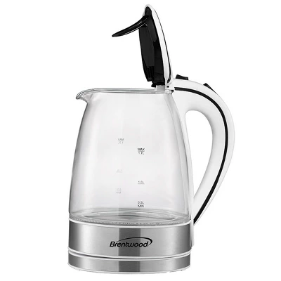 Boil water in minutes with the Brentwood 1.7 Liter Cordless Glass Electric Kettle in White. Cordless kettle lifts off the base for easy filling and pouring. Full glass kettle, concealed heating element and BPA Free. Auto shut off, boil dry and overheat protection for added safety.