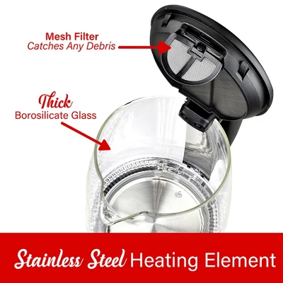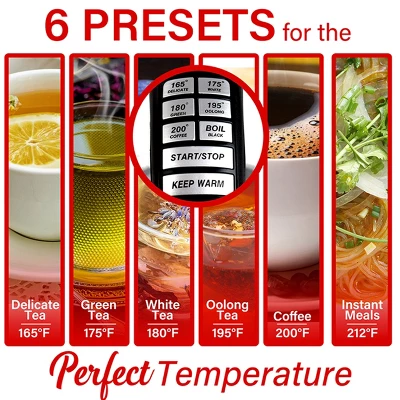 Brentwood Glass 1.7 Liter Electric Kettle with 6 Temperature Presets boils water faster than a microwave and safer than a stove top kettle. Water boils within minutes with a single push of a button. Brew the perfect cup of coffee and masterfully steep all kinds of tea thanks to the 6 smart temperature presets. Quick boil selection for instant foods like oatmeal, noodles, and more. Gorgeous blue LED lights up the glass kettle while boiling. Cordless kettle lifts off the 360° swivel base for easy filling and pouring. Full glass kettle with stainless steel heating element and BPA Free parts keeps water free of impurities. Includes boil dry and overheat protection for added safety. Unit automatically shuts off once water reaches desired temperature.