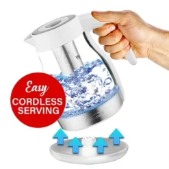 The Brentwood 1.7L Cordless Glass Electric Kettle with Tea Infuser, Black boils water faster than a microwave and safer than a stove top kettle. Water boils within minutes with a single push of a button. Gorgeous blue LED lights up the glass kettle while boiling. Cordless kettle lifts off the 360 swivel base for easy filling and pouring. Conveniently make hot tea, French press or pour over coffee, instant oatmeal and more. Full glass kettle with food grade stainless steel tea infuser, concealed heating element and BPA Free parts keeps water free of impurities. Includes boil dry and overheat protection for added safety. Unit automatically shuts off once water reaches a boil.