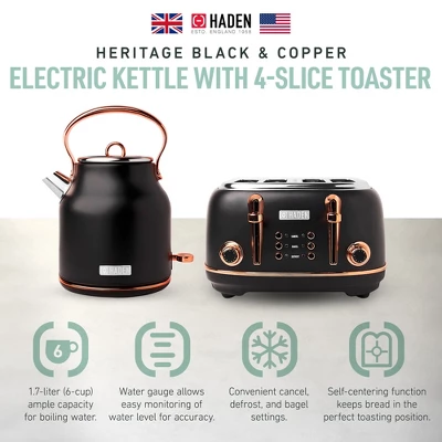 Upgrade your morning with the Haden Heritage 4-Slice Wide Slot Toaster and Electric Kettle. The sleek, durable housing is a hallmark of modern kitchen convenience and their simple beauty is a perfect addition to any countertop. Featuring 4 extra-wide slots, the electric toaster fits a wide range of bread, from standard-sized to thick artisanal slices. The 4 slot toaster’s self-centering function helps keep your bread and bagels perfectly positioned for even toasting, while the adjustable browning control empowers you to tailor the toastiness to your liking. The cancel, defrost, and bagel features of the bagel toaster adapt to your needs for added convenience. Cleanup is easy with the removable crumb trays that trap any residue, maintaining the toaster’s fresh and clean appearance and functionality. This water boiler is perfect for everything from boiling water for tea to craft coffee makers. Thanks to the 1.7-liter body, equivalent to 7 cups, you can heat up or boil up to 1.7 liters of water at a time. The electric kettle for boiling water is designed with a 360-degree base, too, which ensures it will not tip over and spill hot water. Utilize the indicator light to know when the water in the electric pot is fully boiled. Additionally, the boil-dry cut-off protection adds an extra layer of safety to keep the stainless steel kettle from operating without water. If you forget to turn the tea kettle off, the auto shut-off feature will take care of that for you. Inspired by British homes, architecture, and landscapes, this HADEN Heritage toaster and kettle feature a chic Black & Copper color scheme.The HADEN Toaster and Kettle embody the fusion of innovation and modern functionality. Add these appliances to your kitchen necessities and take your morning to the next level.