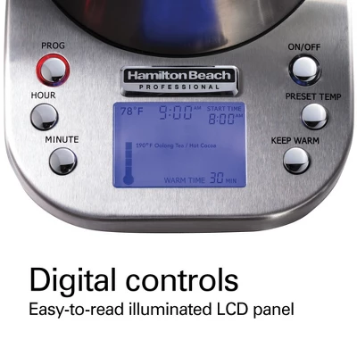 The Hamilton Beach Professional Digital Kettle boils water ultra-fast for tea, pour-over coffee, hot chocolate, soups and more. Digital controls, 6 pre-programmed settings, an LCD readout and programmable start time offer maximum control.