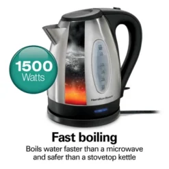 - FAST BOILING WITH 1500 WATTS: This electric kettle boils up to 1.7 liters of water faster than a microwave and safer than a stovetop kettle. Make a quick cup of tea, coffee and more without the long wait — perfect for hectic mornings.