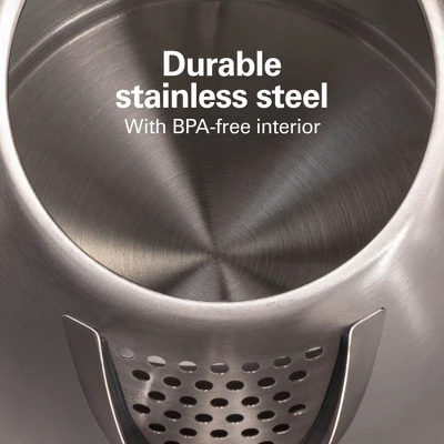 The Hamilton Beach® Stainless Steel Electric Kettle has 1500 watts to boil up to 1.7 liters of water faster than a microwave and safer than a stovetop. You’ll love the convenience of making a quick cup of tea, instant coffee, French press or hot cocoa without the wait. It’s perfect for hectic mornings or anytime you need to quickly boil water to make a bowl of ramen noodles or instant oatmeal. The automatic shutoff feature with boil-dry protection provides peace of mind and keeps the kettle from scorching if the water gets too low. Boiling and heating water is easy with the simple on/off switch on the back, and the attractive blue indicator light on the front illuminates when the power is on. Designed with durable stainless steel and a BPA-free interior, so you don’t have to worry about chemicals getting into your cup. Convenient cord-free serving lets you lift the kettle off the base to serve hot water at the tabletop or anywhere you’re serving hot beverages.