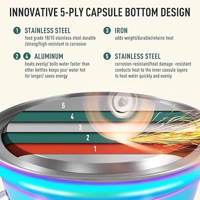Discover this amazing tea kettle perfect for any kitchen! Made of food – grade stainless steel, it offers durability and easy cleaning. The unique rainbow surface not only looks cool but also adds a decorative touch to your cooking area. Its innovative 5 – layer bottom enhances heating efficiency, boiling water faster than regular tea pots, saving you precious time and energy. With a large 3.5L (3.7Quart) capacity, it’s great for family gatherings or parties. The ergonomical folding handle and heat – resistant lid ensure safe and easy handling when pouring boiling water. The flip – up spout cover makes filling and pouring a breeze, and the folding handle allows for convenient storage. It can be used on gas, electric, and induction stovetops. Enjoy the loud whistling sound that alerts you when the water is boiled, so you can focus on other tasks without worry. Upgrade your tea – making experience today!