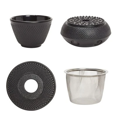 Give this 6 piece Japanese tea cups and pot set as a thoughtful gift to a friend, loved one, or tea connoisseur. The ergonomic fold-down handle and shortly curved spout allow for easy grip and convenient pouring. Made from durable cast iron, this teapot for loose-leaf tea is an ideal alternative to traditional porcelain, stainless steel, and aluminum teapots. Please note this 40-ounce black teapot is not for stovetop use. For best results, heat water into a separate vessel, then pour it into the cast iron teapot warmer or use the warmer to boil water. CAUTION. Cast iron teacups can become hot to the touch when filled with hot beverages. Please use caution to avoid burns.