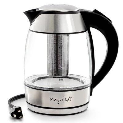 Make all your favorite hot beverages and more with the Mega Chef 1.8Lt. Glass Stainless Steel Electric Tea Kettle. This kettle has a sleek design with a stainless steel finish that looks great in any kitchen. See when the water is boiling with the clear glass construction. Heat up water worry free with the auto shut off feature!