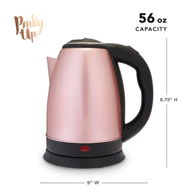 Preparing for tea time has never easier, faster, or cuter. This chic electric kettle comes in a shimmering rose gold, boils water in under three minutes, and has a drip-free spout.Quantity: 1Material: Stainless steel and plastic with rose gold finishCapacity: 56 oz.Includes: heating pad, cord-free serving design, drip-free spout110V, 60 Hz, 1000W