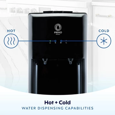 The Primo Water® Bottom Loading Classic 2 Temp Water Dispenser makes it easy to enjoy hot and cold water at home or in the office. With a classic bottom-loading design, there’s no heavy lifting or spills – just quick, tool-free setup and push-button controls that keep things simple. The durable stainless steel finish adds everyday style and stands up to wear, while LED lights show heating, cooling and when it’s time for a new bottle. It delivers continuous cold water for up to a minute and includes a 2-step child safety lock for added peace of mind. This water cooler comes with free water coupons and fits most 3- and 5-gallon bottles.