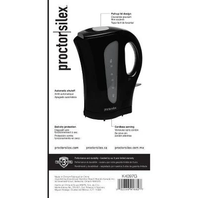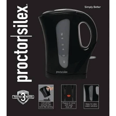 Faster than a microwave and safer than the stovetop, the Proctor Silex 1.7 Liter Electric Kettle is perfect for your dorm, the office or home. This kettle has a detachable cord for easy pouring and automatically shuts off when the water comes to a boil.