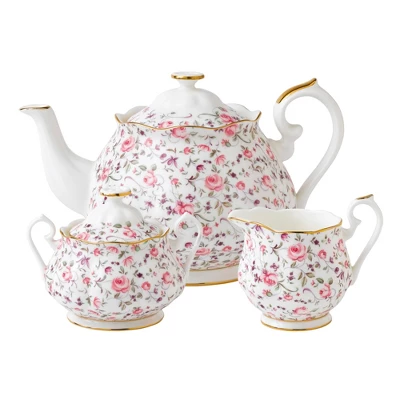 Vibrant and vivacious, Rose Confetti is a beautiful new addition to the vintage patterns that have made Royal Albert famous the world over. Youthful and exuberant, this beautiful Rose Confetti 3-Piece Tea Set includes a teapot, covered sugar bowl and creamer, all charmingly fashioned in fine bone china and combining classic form with intricate detailing, vibrant colors and a lustrous gold rim.