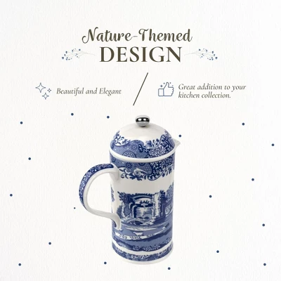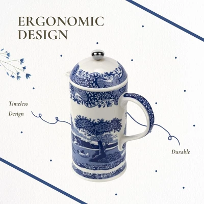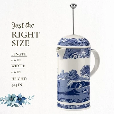 Elevate your daily coffee ritual with the Spode Blue Italian French Press, a 28 oz porcelain cafetiere that combines classic elegance with modern brewing convenience. Designed with a stainless steel plunger for smooth extraction, this manual coffee maker brings full-bodied flavor to every cup. Whether placed on a coffee cart, kitchen shelf, or countertop, it doubles as a stunning display piece thanks to its finely detailed 18th-century Imari Oriental border and countryside-inspired scene.As part of your coffee cart accessories, this press offers both form and function. Brew enough to share or savor solo moments with style, all while enhancing your home coffee setup. The porcelain body is dishwasher safe for easy cleanup, while the metal plunger should be hand washed to preserve its quality.From casual mornings to weekend hosting, this French press coffee maker seamlessly fits into any home coffee bar or gifting occasion. With its artisan craftsmanship and Spode heritage pattern, it’s more than just a coffee tool—it’s a centerpiece of your brewing experience.