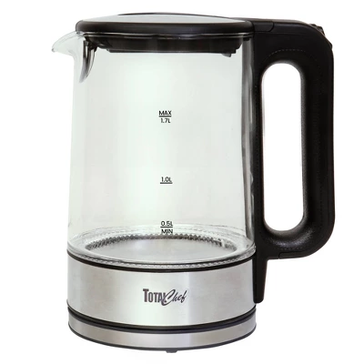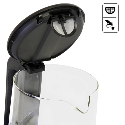 This electric tea kettle combines crystal-clear glass and stainless steel construction, bright blue LED lighting, and a wide-mouth opening for the perfect mix of form and function. Cordless kettle body rotates 360 degrees and lifts off the base for convenient filling and pouring and auto shut-off, boil dry protection, and a non-slip base ensures your water will be ready quickly and safely.